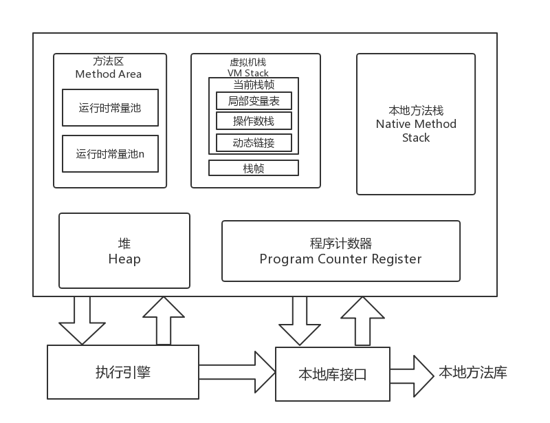 - 发挥的作用与虚拟机栈类似,区别在于虚拟机栈为虚拟机执行Java方法(字节码)服务,而本地方法栈则是为虚拟机使用到的Native方法服务,如Java访问C语言的方法、汇编程序等。