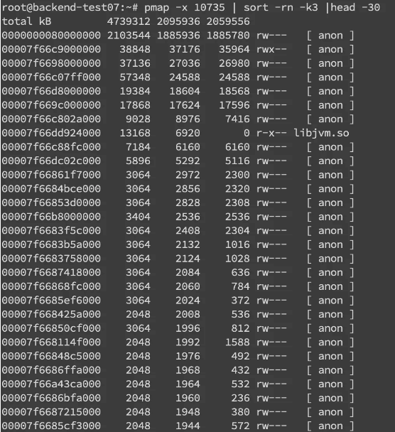 可以看到jcmd分析出来的内存十分详细,包括堆内、线程以及gc(所以上述其他内存异常其实都可以用nmt来分析),这边堆外内存我们重点关注Internal的内存增长,如果增长十分明显的话那就是有问题了。detail级别的话还会有具体内存段的增长情况。