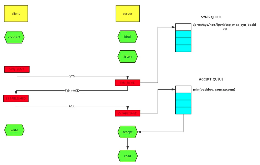 全连接队列的大小取决于min(backlog, somaxconn)。backlog是在socket创建的时候传入的,somaxconn是一个os级别的系统参数。而半连接队列的大小取决于max(64, /proc/sys/net/ipv4/tcp_max_syn_backlog)。