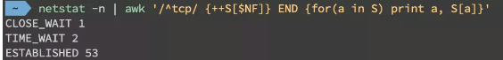 用ss命令会更快ss -ant | awk '{++S[$1]} END {for(a in S) print a, S[a]}'